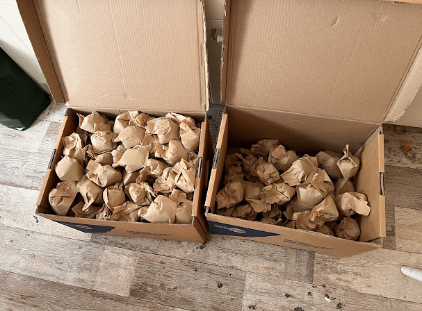 Ungefähr 250 Teebeutelchen müsste Ich denn dann da nach Adam Riese und Eva Zwerg herausbekommen haben. Ich hab sie nicht gezählt.